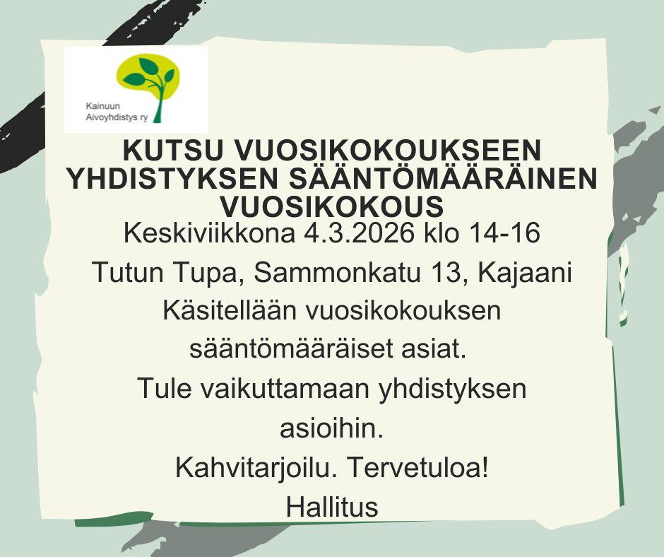 Hyvät jäsenet! Kutsumme teitä kaikkia alla olevalla kutsulla. KUTSU KAINUUN AIVOYHDISTYS RY:N YLIMÄÄRÄINEN VUOSIKOKOUS Aika: Lauantaina 29.11.2025 klo 14.00-15.00 Paikka: Vaarankylän kylätalo,…