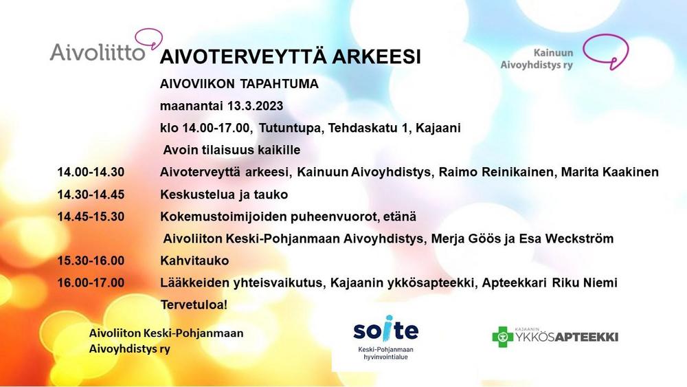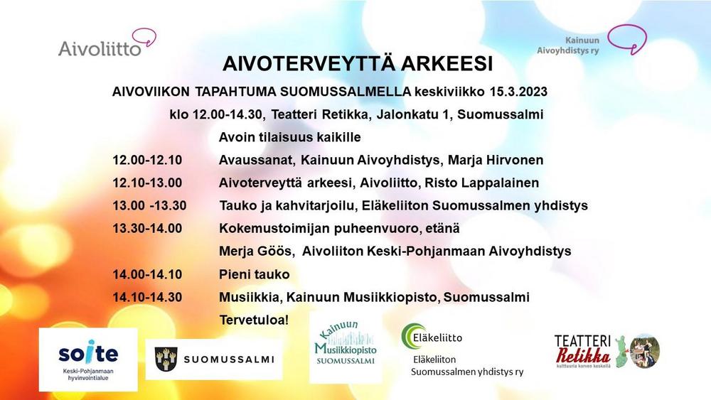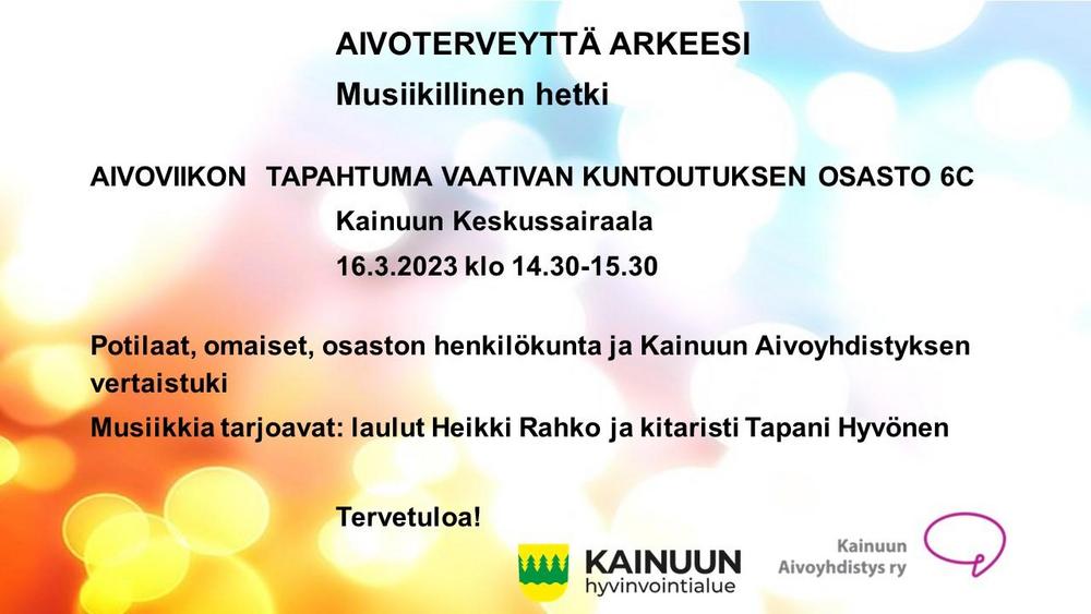 Tutustu Kainuun hyvinvointialueella oleviin Aivoviikon tapahtumiin. Aiheena Aivoterveyttä arkeesi. Järjestäjinä toimivat Aivoliitto, Kainuun Aivoyhdistys, Aivoliiton Keski-Pohjanmaan Aivoyhdistys, Kainuun hyvinvointialue, Kajaanin ykkösapteekki, Suomussalmen kunta, Kainuun musiikkiopisto Suomussalmi, Teatteri Retikka Suomussalmi, Eläkeliiton Suomussalmen yhdistys ry, laulut Heikki Rahko/Tapani Hyvönen.
