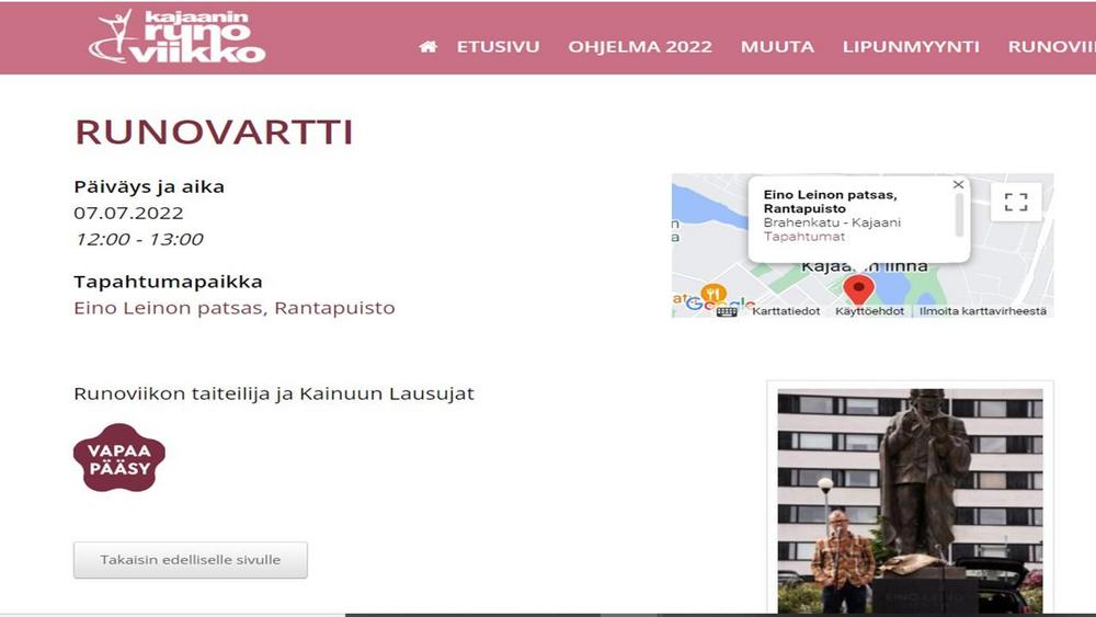 Kutsu jäsenistölle kulttuurikävelylle 7.7. klo 11.45 kokoontuminen Kajaanin jokirantaan Eino Leino -patsaalle, jossa Kainuun Lausujien runovartti. Tämän jälkeen Runopolkukierros Kynskin sillalta Kaukametsään. Matkalla 10 runopistettä, jotka esittelevät Rami eli Raimo Reinikainen ja Marita Kaakinen.