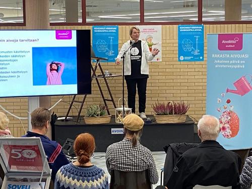 Kainuulaiset halusivat kuulla - Mitä aivoterveys on- ja olivat lähteneet runsaslukuisesti liikkeelle. Järjestäjät tarjosivat kolmetuntisen aikana tarjottimen mistä jokainen voi valita mikä itseä kiinnosti kuunnella aivoterveydestä. Tutustua myös yhteistyökumppaneidemme esittelypöytiin. Ihmiset kuuntelivat hyvin tarkkaavaisina ja tunnelma oli hyvin iloinen ja leppoinen. Jäämme miettimään yhdistyksessä miten jatkamme aivoterveyden vaalimista.