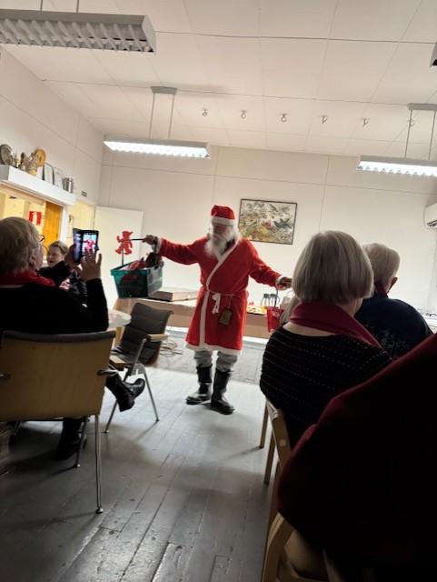 Mutta ohjelmanumero ei päättynyt tähän. Siirryimme takaisin isännän "kyökin" puolelle. Hyvä kahvituoksu ja joulutortut odotti vielä pikkujouluväkeä. Joku porukasta sanoi hivenen aikaisemmin että se joulupukki ei taida päästä tähän pikkujouluun muulla kuin helikopterilla ja niin oveen kuului kolkutus ja sieltä punalakki ja punaviittainen joulupukki ilmestyi. Hänellä oli meille terveisiä mm. lämmön ja sydämellisyyden antamisesta toisillemme ja miten se lähimmäisen rakkaus syntyy. Kiitos Raimo. Sitä me jokainen voimme pohdiskella ja antaa.
