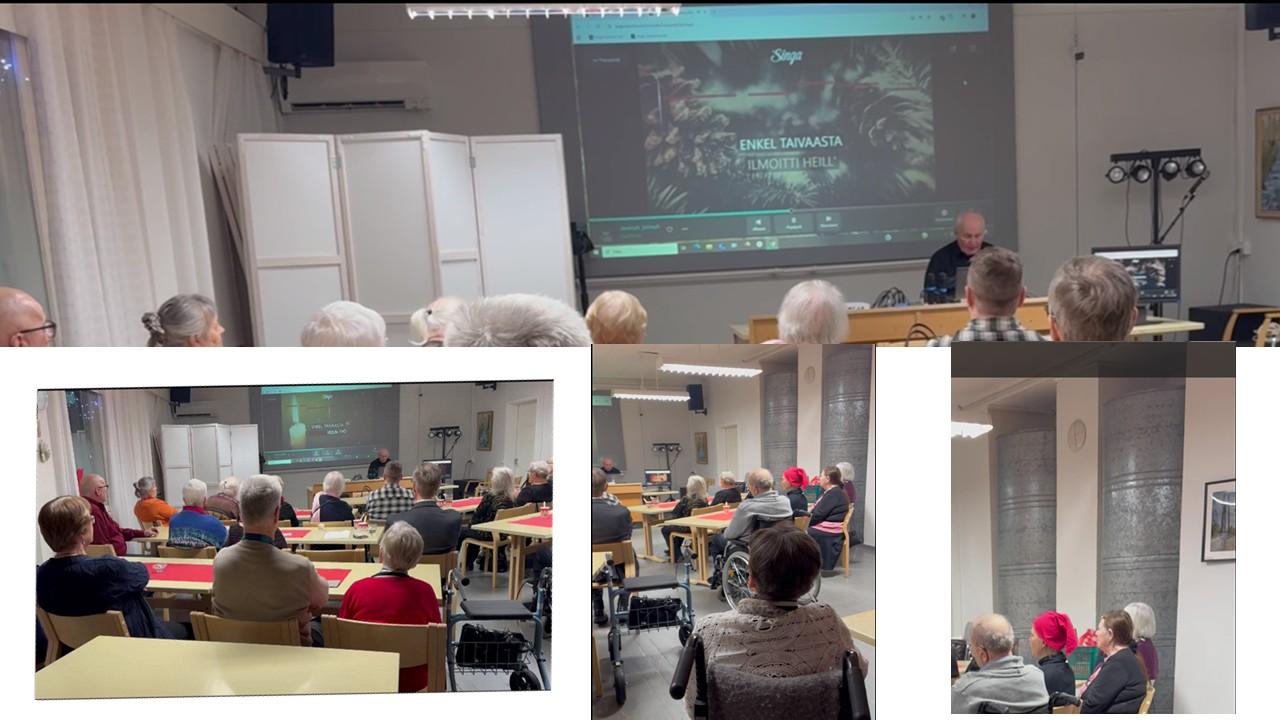 Ruokailun jälkeen siirryimme laulamaan yhdessä joululauluja salin puolelle. Kapellimestarina ja äänen avaamisessa toimi Antti. Eikä Antti tarvinnut väkeä houkutella, hän kysyi laulu laulun jälkeen vain että mitä lauletaan seuraavaksi. Kiitos Antti. Oli hyvä rauhoittava tunnelma, tuikut paloi pöydillä punaisten kaitaliinojen päällä, jouluvalot ja joulutontut ikkunoissa, isot pönttöuunit loivat lisäksi lämpöä ja joulun tunnelmaa. Kaikki hyvä oli läsnä ja nautittu hyvä jouluateria yhdessä, joululaulut kaikui meidän laulamana ja siinä oli läsnä yhdistyksen pikkujoulu.