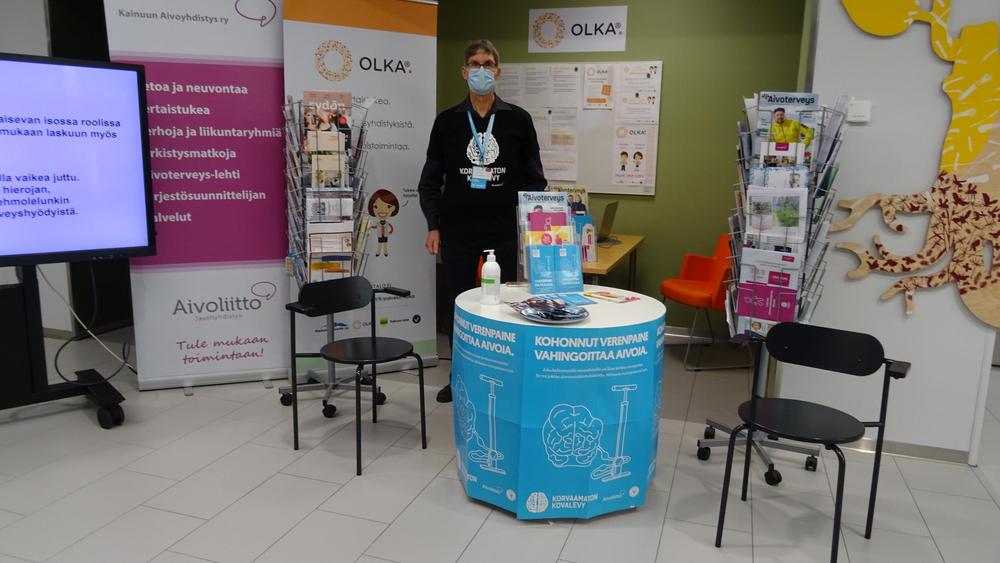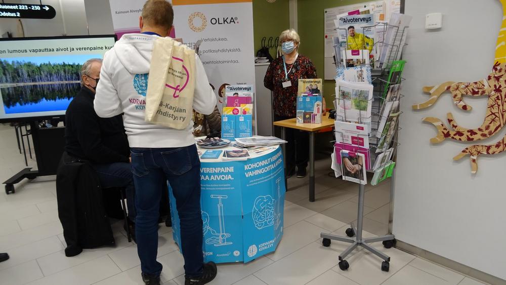 Vapaaehtoiset olivat jakamassa tietoa verenpaineesta 13.10.2021 Kainuun OLKA pisteellä Kainuun uudessa sairaalassa.